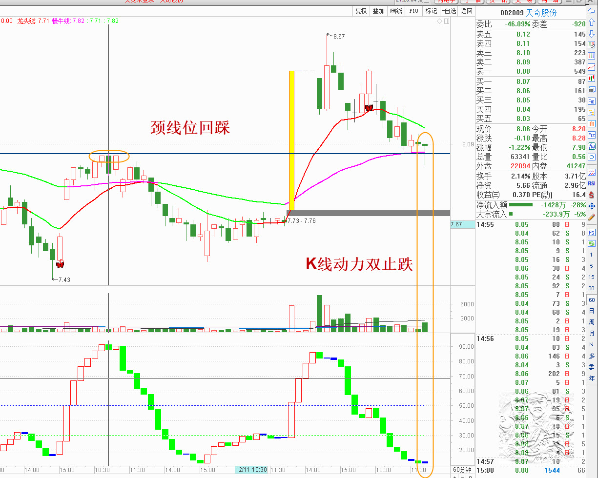 6、亮剑点兵:002009 天奇股份,工程机械板块短线龙头,小时级别回抽颈线位走势,且受到明显支撑,最后一小时的T型线,显示有转多迹象,可短线积极关注(附图三)